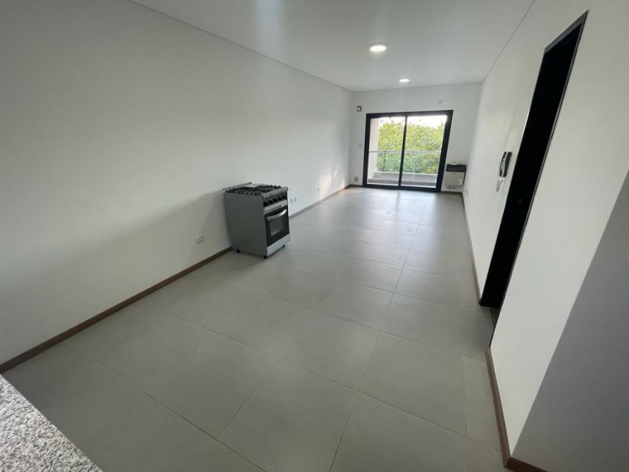 Amplio living comedor con salida al balcon, cocina integrada con mesada de marmol negro y muebles bajo mesada de excelente calidad.